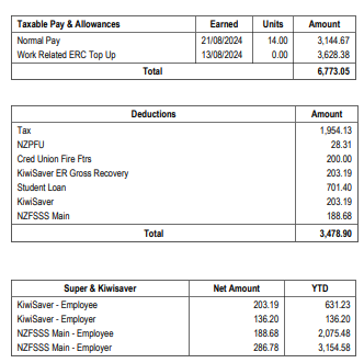 FENZ also provided a pay slip example where both Kiwisaver and FireSuper deductions have been made.